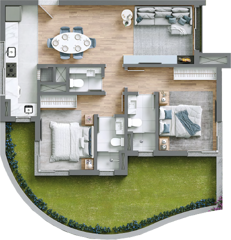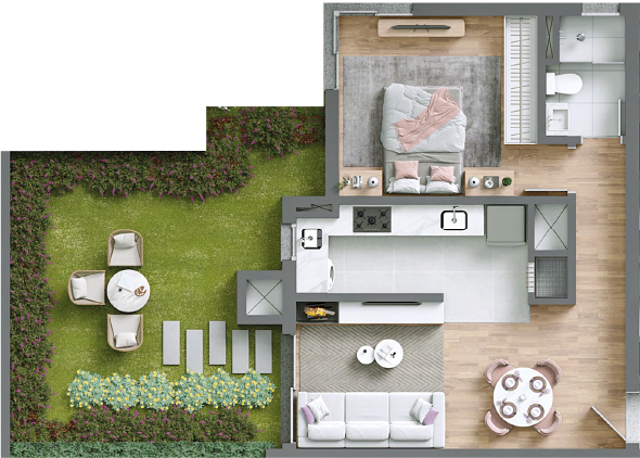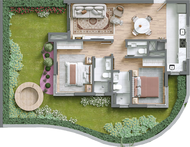 O paisagismo do Giverny convida a uma vida de plenitude ao ar livre, em espaços acolhedores e envoltos pelo abraço da natureza. Um design biofílico que se revela em cada detalhe transforma o ambiente em um eterno quadro vivo, que se renova em cores e emoções a cada estação do ano, atraindo pássaros e borboletas. Uma experiência sensorial e harmoniosa, onde o jardim pulsa em perfeita sintonia com a natureza.